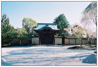 順著二年坂往下走,一路逛到高台寺,高台寺是豐臣秀吉的夫人北政所寧寧為紀念豐臣秀吉所建,自從看了利家與松後,對這位寧寧夫人多了那麼一些親切感,逛這個園的時候也就格外覺得有興味,這裡不像清水寺那樣的人潮洶湧,庭園中只有三三兩兩的遊人,從熱鬧的二年坂走進來,彷彿進入另一個世界.園中的靈屋是祭祀秀吉與北政所的地方,左右兩側的北政所與秀吉的坐像因年代久遠早已斑駁,旁邊的裝飾也已經褪色,但仍能想見當時之華麗精美.從靈屋走出來,在庭園中捕捉幾個鏡頭,累了就在方丈處歇歇腳,欣賞方丈前庭內白沙堆成的圖案,或許這裡沒有銀閣寺的銀沙灘來的有名,但在這兒所獲得的寧靜閒適卻是銀沙灘所不及的.