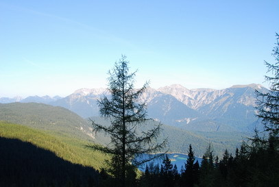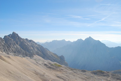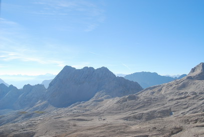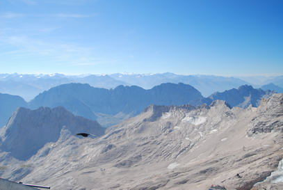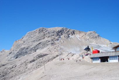 好不容易重見光明,終於到了終點站--冰河平台,這裡的標高是2600公尺,也就是說要上祖格峰我們還得再搭一段纜車才行,在上去前,我們先在這冰河平台逛逛,既然叫做冰河平台,原先期望可以看到冰河或是雪原之類的景象,但不知是今年天氣異常暖和,還是這裡高度還不夠高,看出去是一片荒礫,好像來到寸草不生的異世界一般.