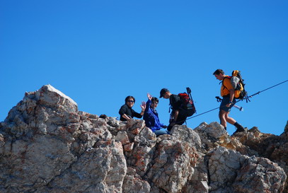 但這裡還不是至高點,標高2964,豎有金色十字架的地方才是真正的最高峰,大家都喊著要去征服最高峰,我自知肉腳,膽小加懼高症,還是乖乖地在這兒幫忙看行李兼拍照.坐在一旁休息時,遇到一團台灣的遊客,跟其中一對老夫妻攀談了起來聊得太開心,結果差點錯過CC他們攻頂的鏡頭.