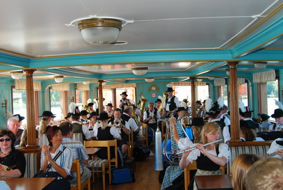 登上這復古的蒸汽船內部空間不大,我們坐的地方有塊玻璃,透過它可以看到汽船的葉片,只是船一開動,葉片也跟著轉動,水居然就從玻璃縫中滲過來,嚇了我們一跳!坐沒多久突然聽見熱鬧的音樂聲,原來今天在船內的餐室裡有個樂團,樂團搭船時還順便沙必斯幾首樂曲,聽著巴伐利亞的慶典音樂,讓人心情也high了起來~有興趣看他們表演的人,請到我的相簿裡點選樂團表演