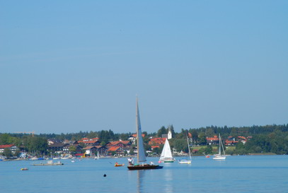 聽聽音樂時間一下子就過了,到現在連午餐都還沒吃呢,為節省時間也想待在船上餐室中休息,所以我們坐上回程的船隻後,就到餐室裡面點飲料跟扭結麵包來吃,今天之所以這麼趕都是因為跟租車公司約好下午五點要在慕尼黑還車的緣故,雖然整個男島女島逛完大概只需三,四個小時,但如果能有更充裕的時間,一定能更深入地體會這裡的美好