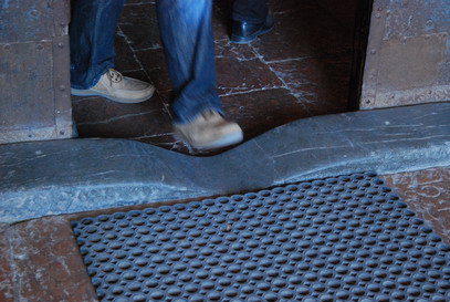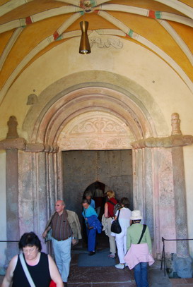 走沒多久,高塔就出現在眼前,順著牆邊走著沒多久就進入修道院,這是創立於西元770年的修道院,目前的建築還維持著11世紀的羅馬樣式,小小的修道院倒吸引了不少朝拜的人群,瞧那門檻都已被踏出深深的弧度來了~