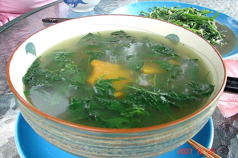 。不過,老闆娘說這野菜是當天現採的,對身體很好,看在這份上,那就既來之則吃之吧!這湯清清爽爽地,裡頭的野菜跟炒的野菜種類不同,帶點苦味但配上甜甜的南瓜,滋味卻奇妙地融合,喝起來感覺就很健康的一道湯品。