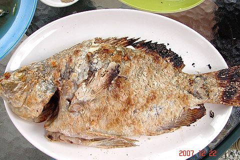 第四道烤魚,整條魚現烤上桌,服務生說這是台灣鯛。「咦?什麼是台灣鯛啊?」CC說:「笨!就是吳郭魚啦!」切~