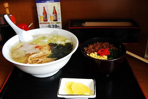 有一大碗拉麵和迷你版的三色丼