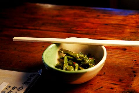 隨後,一個女侍拿來菜單,送上一碟小菜,順便問我們要喝點什麼