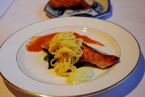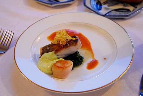 外皮煎得香酥的魚排,以及外層煎到金黃的干貝:魚肉鮮嫩,干貝裡頭還微生