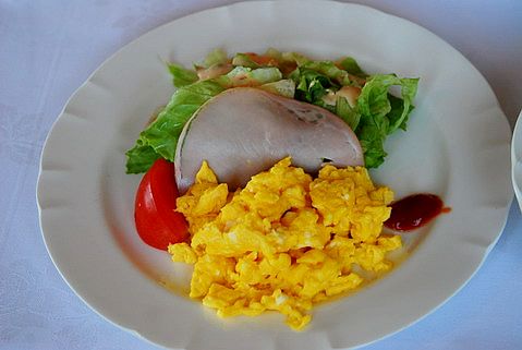 鬆鬆軟軟的炒蛋加上火腿、沙拉,營養滿點的早餐!